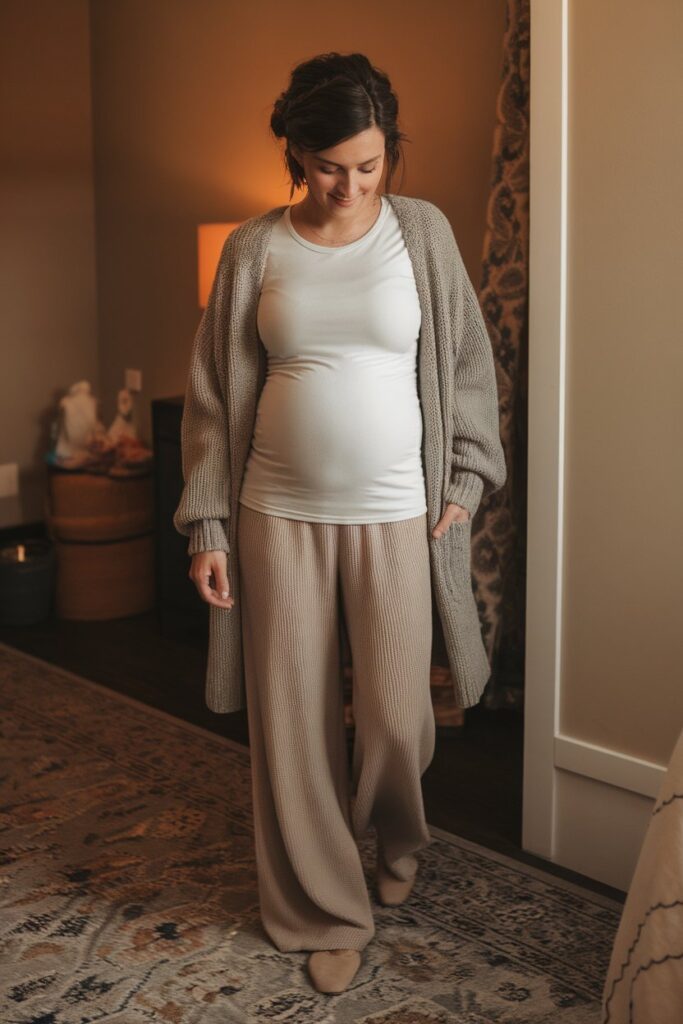 12. Basic tee + cardigan + wide-leg lounge pants