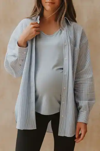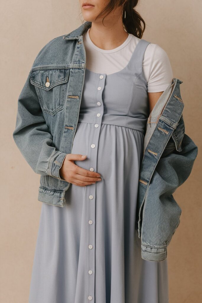 Buttons help nursing, and the denim jacket adds structure. You can wear this to brunch, appointments, or that first “let’s go outside” day.