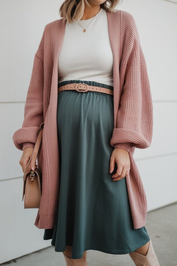 22. Knit wrap cardigan + fitted tee + midi skirt (elastic waist)