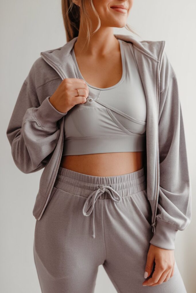 19. Longline sports bra (nursing-friendly) + zip jacket + joggers
