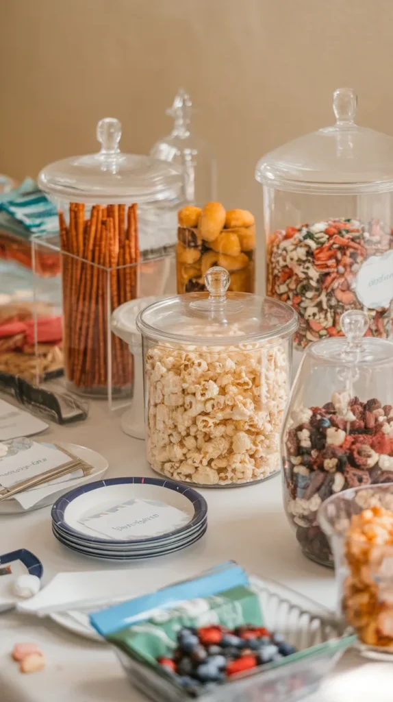 Clear jars make basic snacks look curated. Nobody needs to know you bought pretzels in a bulk bag.